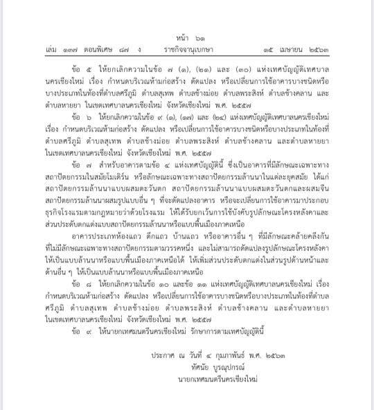 เทศบัญญัติเชียงใหม่ประกาศในราชกิจจานุเบกษาเพื่อปลดล๊อคอาคารเดิมที่มีอยู่ก่อน 19 สค 59 ที่อยู่ในพื้นที่เมืองเก่าให้ได้รับการยกเว้นตามคำสั่ง คสช